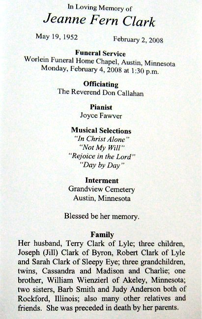 She is survived by her husband, Terry Clark, Lyle; by three children: Joseph (Jill) Clark of Byron, Robert Clark of Lyle, Sarah Clark of Sleepy Eye; by three grandchildren: twins, Cassandra and Madison and Charlie; by one brother, William Wienzierl, Akeley, Minnesota; and by two sisters, Barb Smith and Judy Anderson both of Rockford, Illinois.