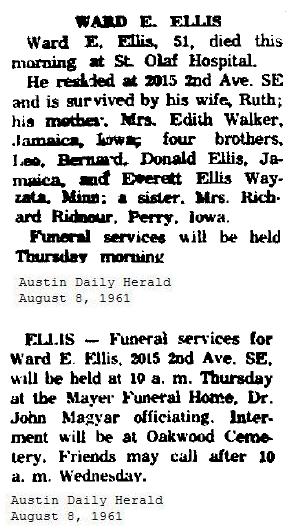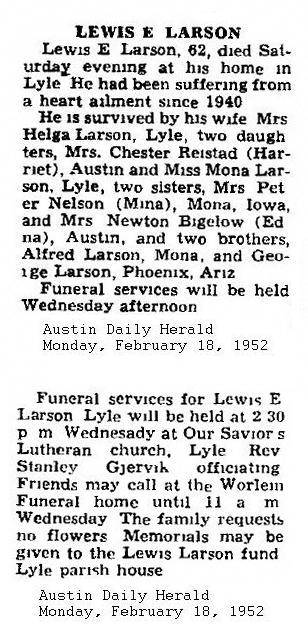 Surviving are his wife, Jennie; three sisters, Mrs. Ella Knutson and Miss Emma Ulven, Austin, and Mrs. H.E. Drake, St. Paul.