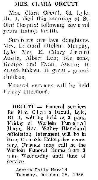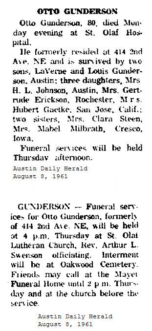Surviving are his wife and three children: Mrs. Blanche Christopherson of Rose Creek, Archie and Alvin of Austin, Minnesota; and one sister, Mrs. Ben Woolworth of Osage.