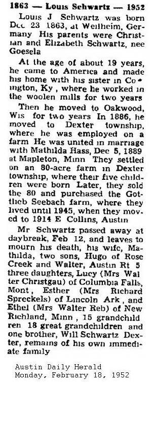 He was a retired farmer in the Rose Creek area and is survived by three sisters, Mrs. Walter (Helen) Baldner . . . Mrs. Amanda Fossey . . . and Mrs. William (Lula) Klusmeier of Rose Creek; three brothers, Alfred of Rose Creek, El . . . and Raymond of Austin.
