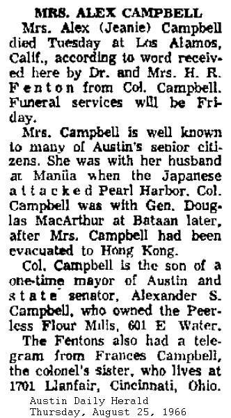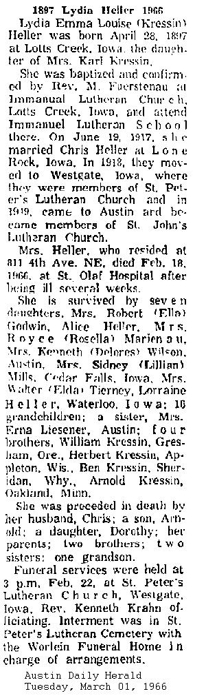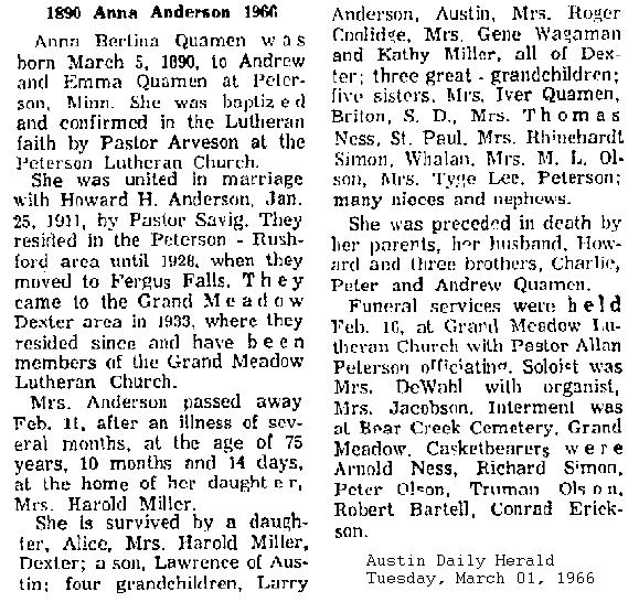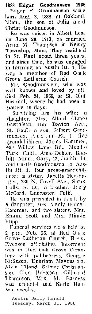 [Obit image below from Austin Daily Herald, Aug. 25, 1966]